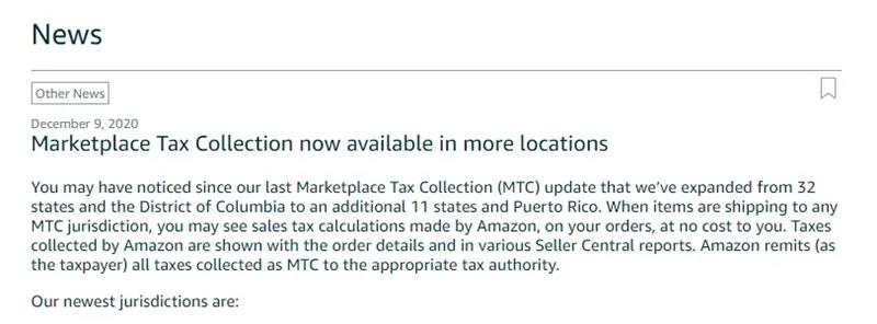 近日,亞馬遜美國站發(fā)布了一則有關(guān)在更多地區(qū)商城征稅(Marketplace Tax Collection)的公告,新增了11個需要由亞馬遜代收代繳銷售稅的地區(qū)。