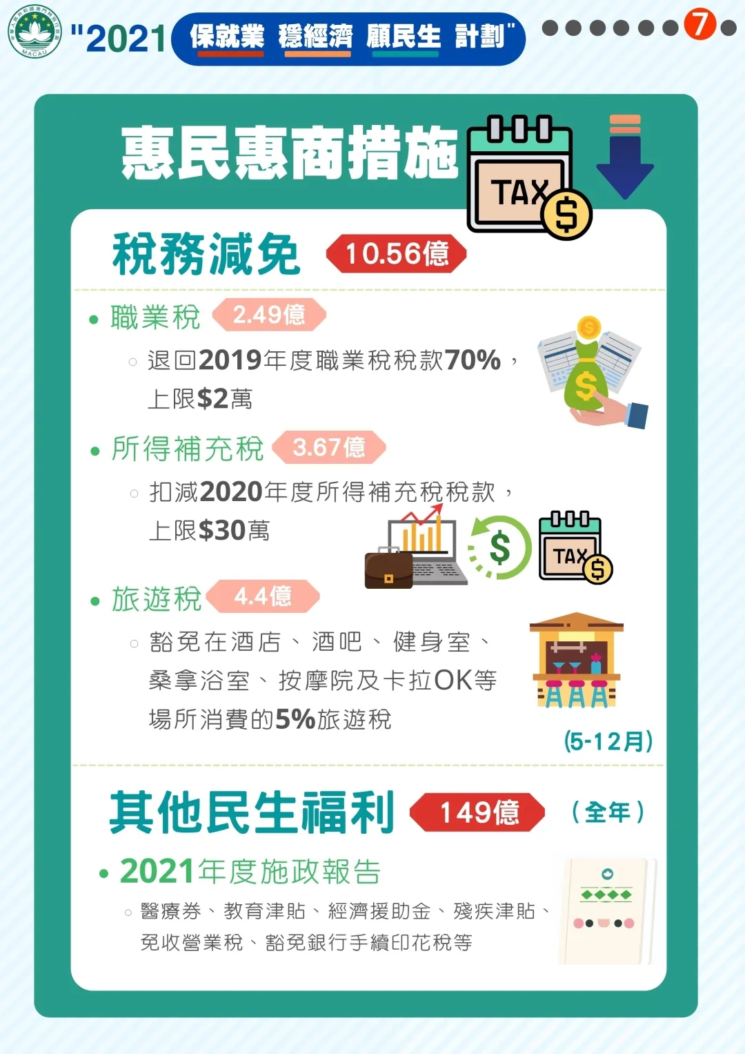 2021年度施政報告:醫(yī)療劵、教育津貼、經(jīng)濟援助金、殘疾津貼、免收營業(yè)稅、豁免銀行手續(xù)印花稅等。