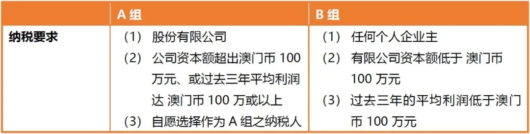 澳門承襲了葡萄牙的稅務(wù)呈交系統(tǒng),將公司劃分為兩大類別,俗稱「A 組」及「B 組」。